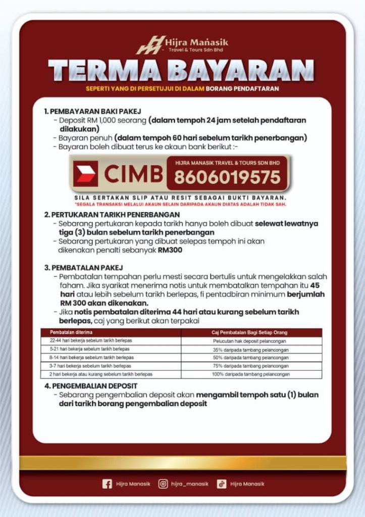 • Semua urusan pembayaran, pertukaran tarikh, dan pembatalan hanya sah melalui saluran rasmi Hijra Manasik Travel & Tours Sdn. Bhd.